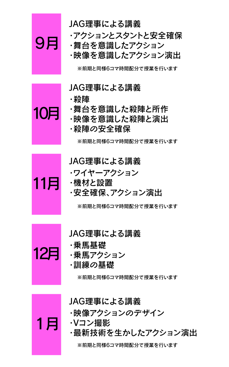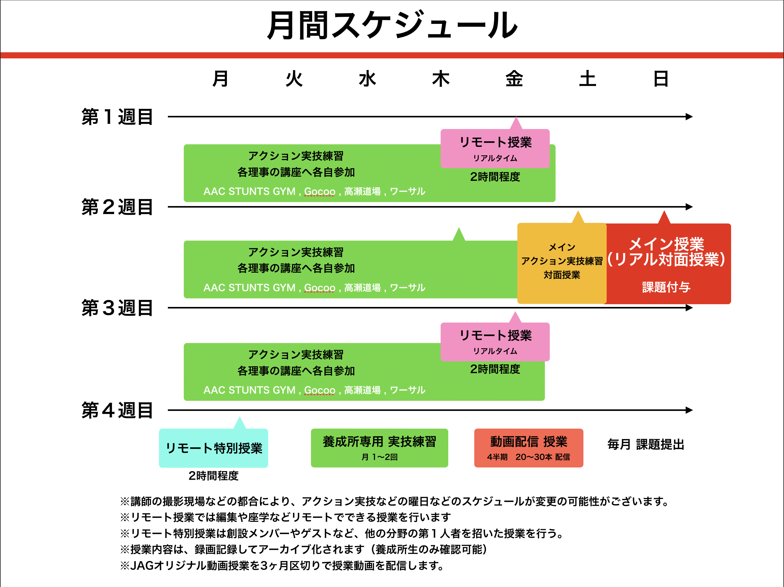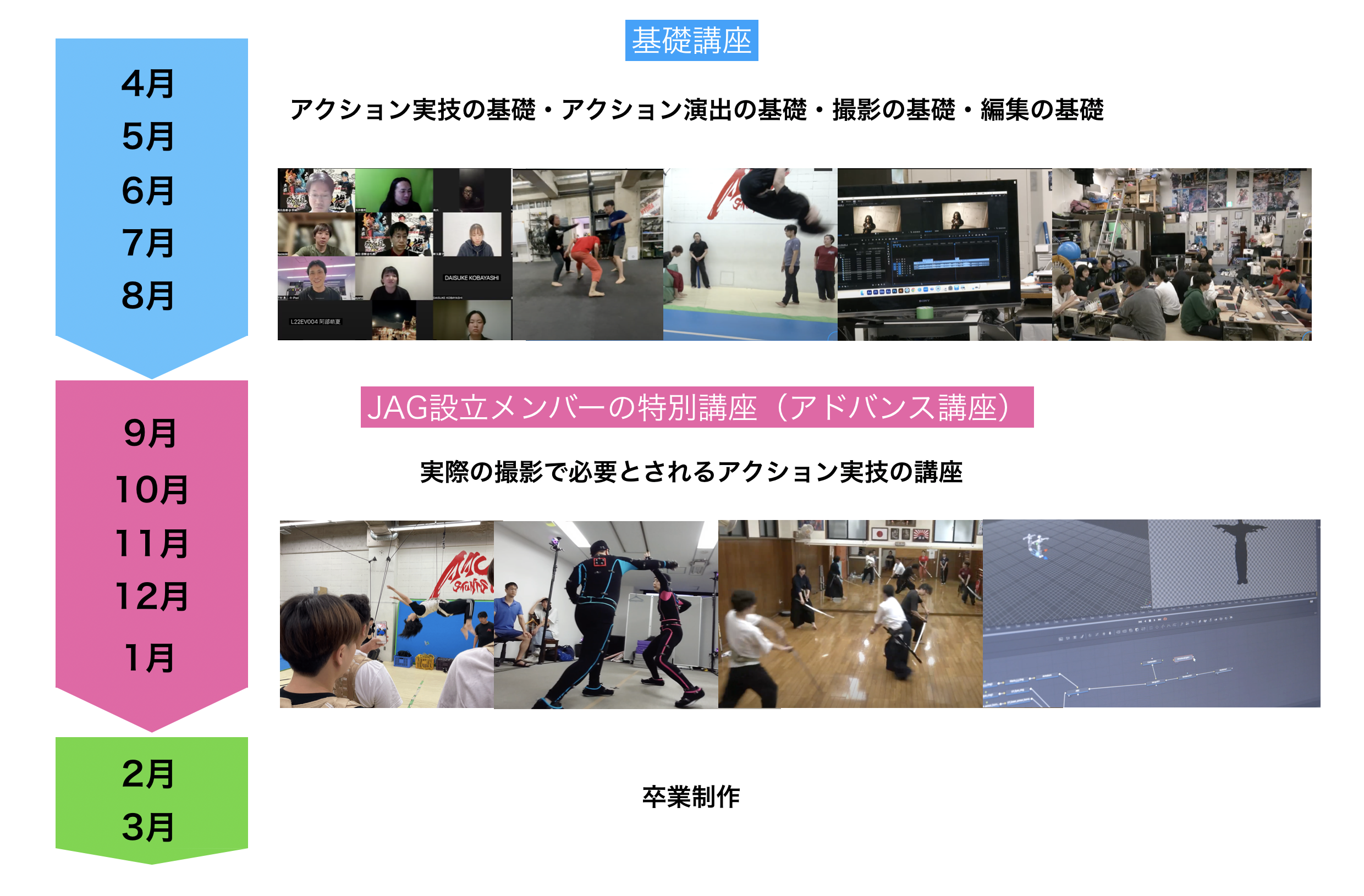 「アクション」というジャンルではありますが、非常に範囲の広い範囲の物事を学び実力をつけなければなりません。そのため、1年間12ヶ月の講義を